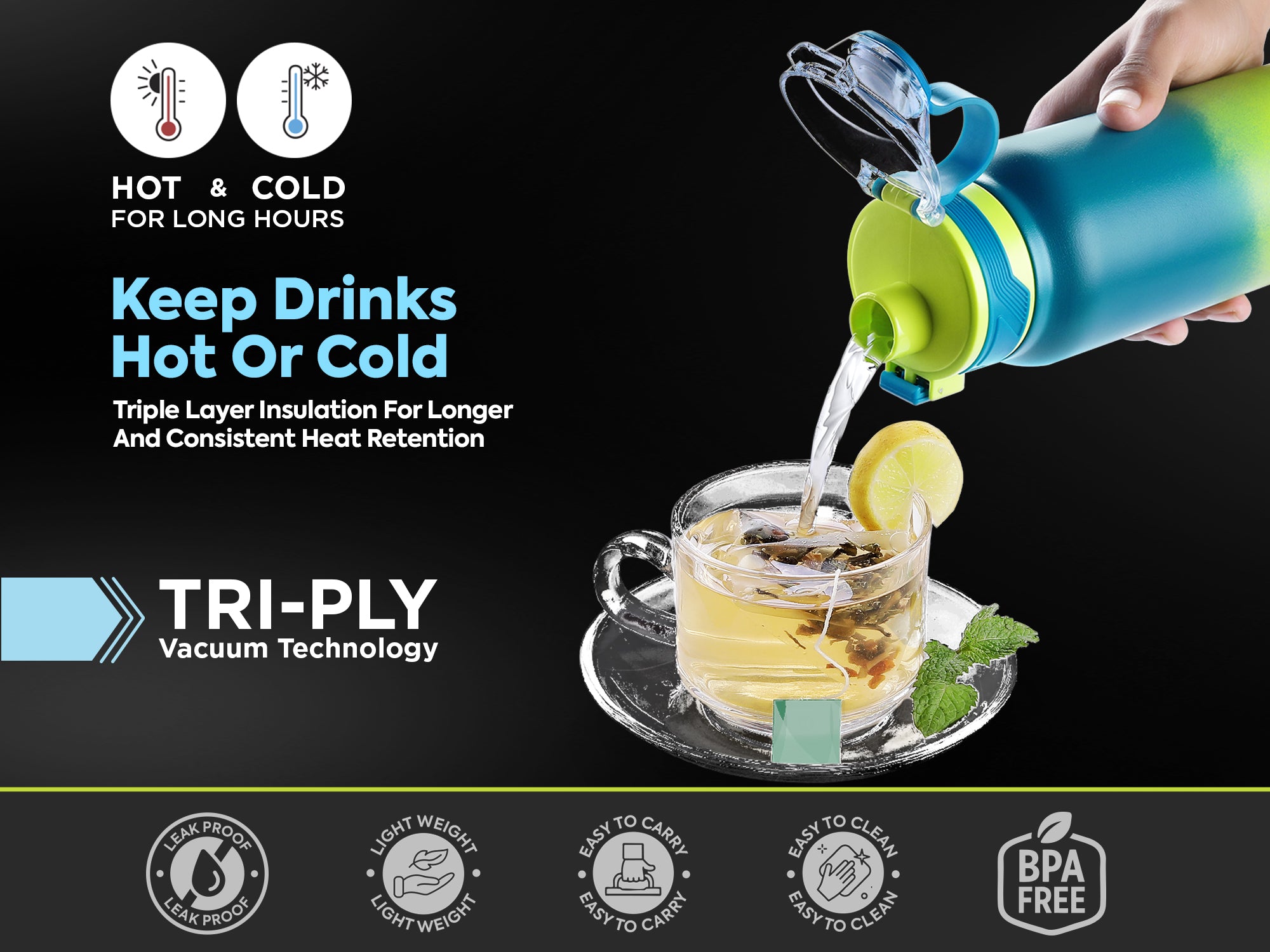 - Advanced Insulation Technology: Engineered with Vacuum Insulated Flask and Tri-Ply construction to maintain Hot and Cold temperatures for hours, ensuring fresh hydration anywhere.