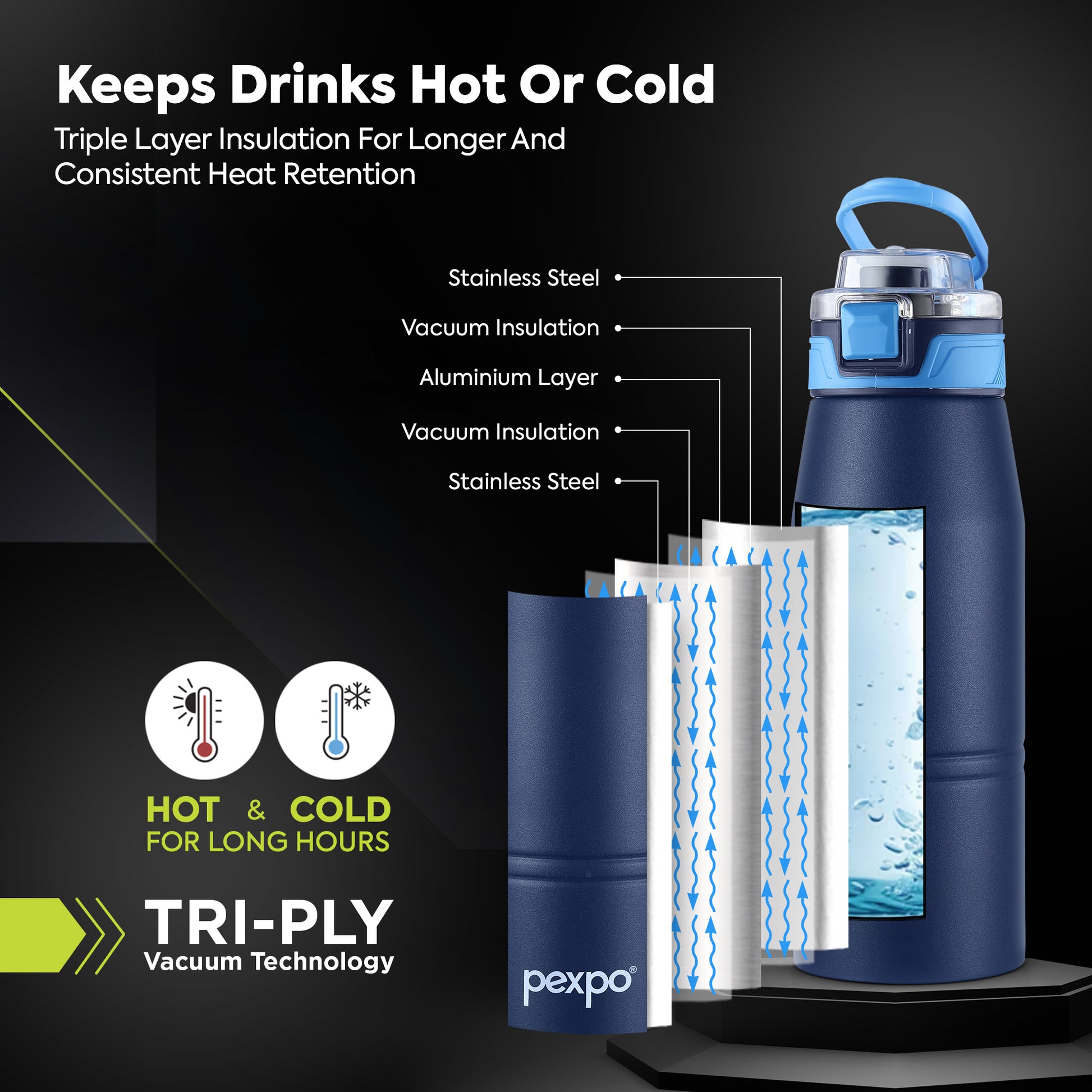 Stay refreshed wherever you go with the Pexpo Atlas Bottle – a perfect blend of safety, style, and performance. Proudly Made in India and ISI-approved, this bottle is crafted using premium 304-grade stainless steel with Tri-Ply vacuum insulation to keep your beverages hot or cold for hours.