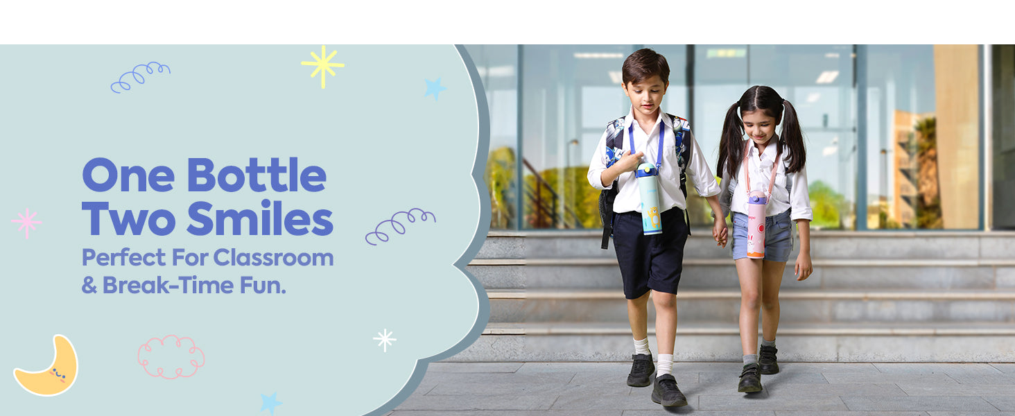 Built with high-quality stainless steel, Pixy offers safety, hygiene, and lasting durability. The embossed art design adds a playful charm, while the soft silicone straw and one-touch lid make it easy for little hands to sip and carry.