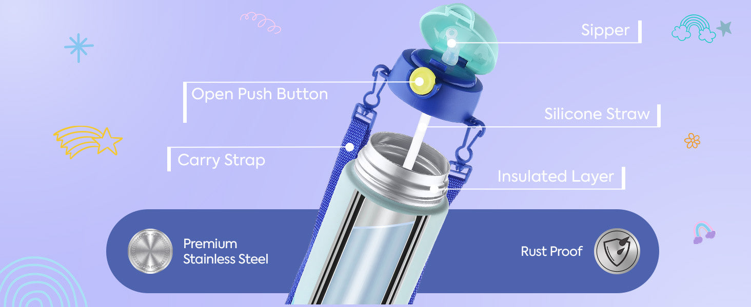 Tri-ply Vacuum Insulation: Keeps beverages hot and cold for hours, ideal for school, picnics, or playtime. The advanced insulation technology maintains a consistent temperature, ensuring every sip feels freshly poured.