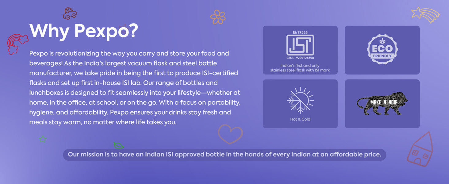 ISI certified and made in India, the Pexpo Pixy Art Bottle blends fun design with trusted performance. BPA-free, leakproof, and backed by a 1-year warranty, it’s the perfect hydration companion for every child’s day.
