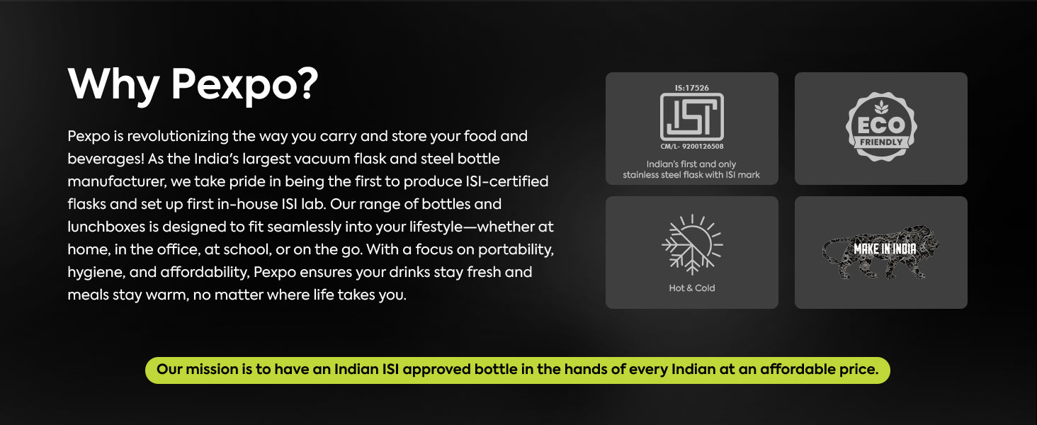 Stay refreshed and confident all day with the Pexpo bottle designed to balance performance, style, and convenience. Equipped with Triple Wall Vacuum Insulated Flask technology, it maintains your drink’s temperature Hot and Cold for hours.